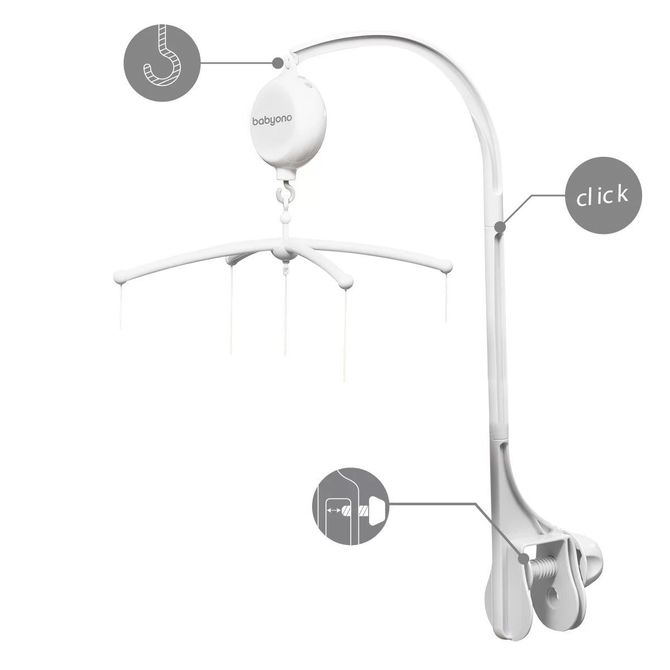 The COSMOS baby crib mobile with electronic music box is an ideal product for a child to help them fall asleep. A steady movement will calm down, and the gentle sound of the music box will soothe your baby. Thanks to the universal holder, the crib mobile can be attached on both a tourist and wooden cot.