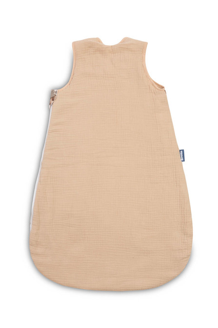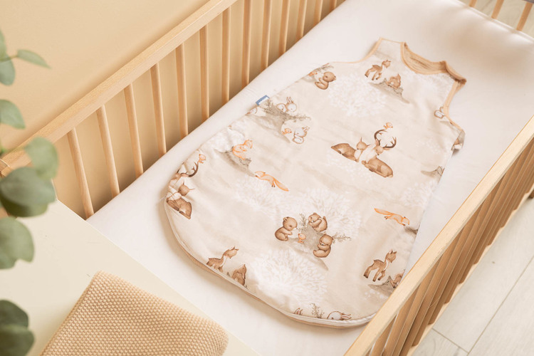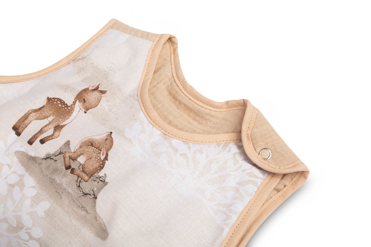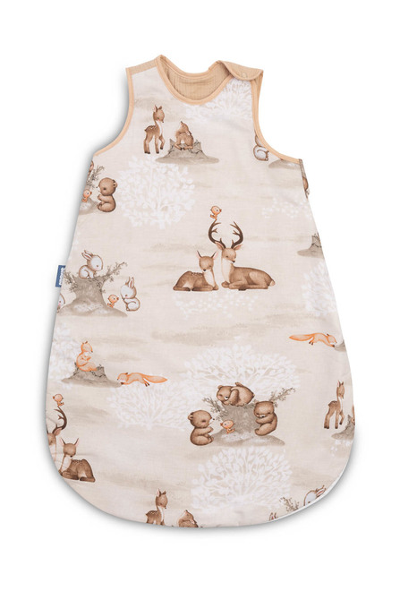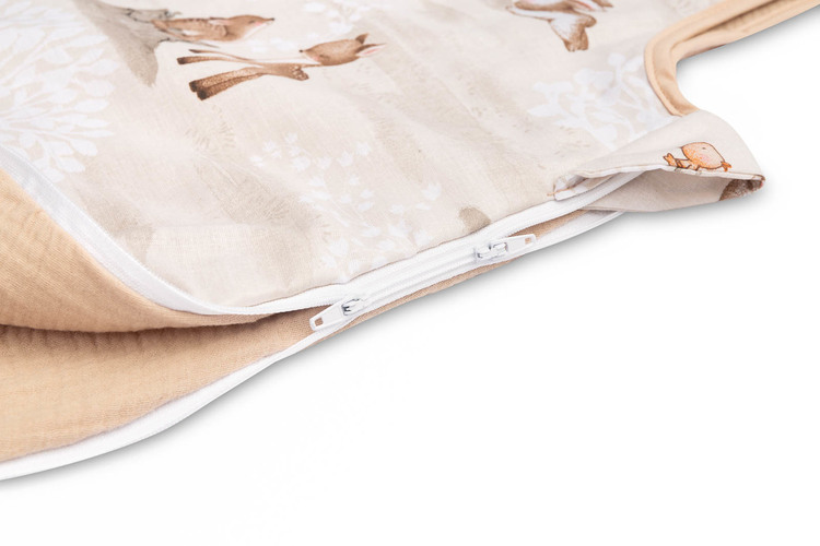 The sleeping bag in size M will serve slightly older children (9-18 months) providing them with warmth and safety. It is sewn from soft cotton filled with padding. The inside and back of the sleeping bag are made of muslin cotton. The product does not contain hard elements that could irritate the child’s skin. It is equipped with a two-sided zipper, led around the sleeping bag, allowing you to change the diaper without taking the child out of the sleeping bag.