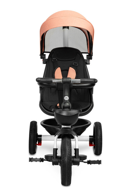 The Dash tricycle is a great alternative to a stroller. It can be used as a bicycle on which the child can ride alone, and as a stroller with a roof, in which the child can be transported both forward and rearward facing. There are baskets at the front and back of the bike that allow you to carry small items. The bike is equipped with 2 footrests: protruding from the bike’s frame and attached to the seat. Each of the footrests is adjustable for the comfort of the child. The rear wheels of the bike are equipped with brakes, allowing you to safely leave the bike without worrying about it going away.