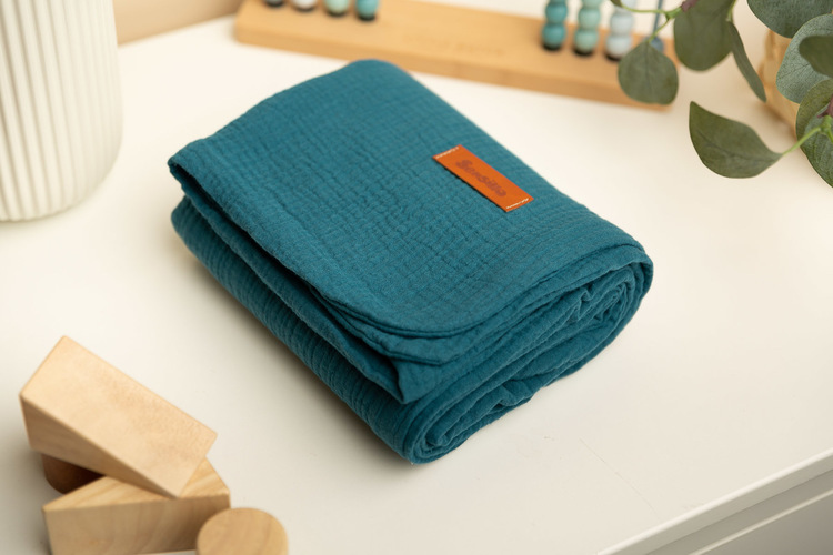 The muslin blanket is made of high-quality 100% cotton fabric. It is made of two layers of cotton, making it light and airy. It will work well during walks on warm sunny days, it can be used as a thicker swaddle, for everyday play or as a cover during feeding. Delicate cotton ensures proper air circulation, and also does not sensitize or irritate the baby’s skin. An additional advantage of the blanket is the beautiful texture of the fabric.