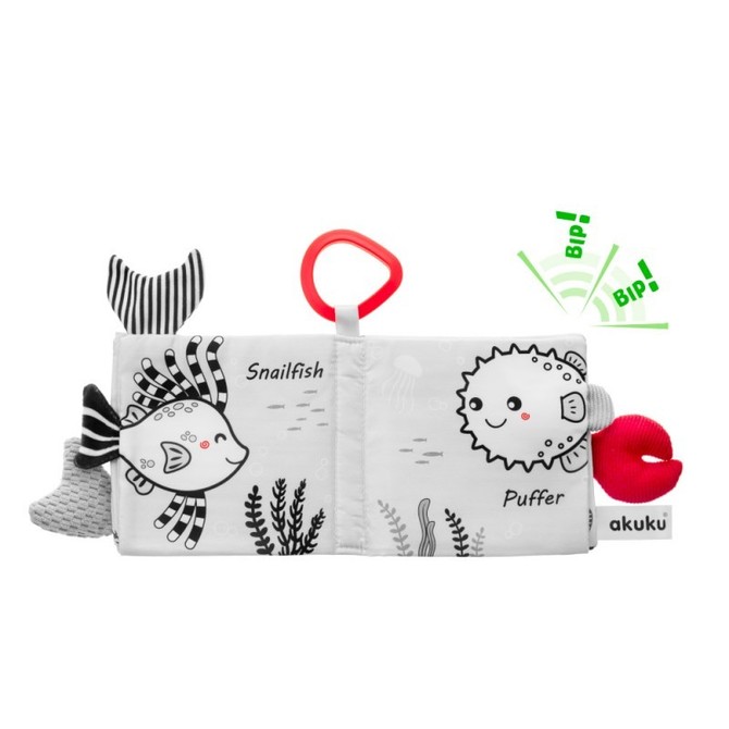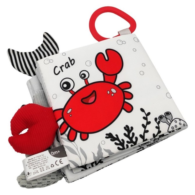 Material sensory book MARINE ANIMALS is the perfect first reading for a baby. It stimulates child’s imagination, creativity and curiosity, supports child’s natural development by activating the sense of sight, touch and hearing, and supports the training of manual skills and hand-eye coordination. It is also a great way to instill a love of books in your little one. The colorful pictures are great for storytelling. Sensory book has many elements that attract the child’s attention, creates unlimited play and supports the parent in playing with the child, thanks to nice faces in the form of a mask. The book is completely safe for the child. Akuku sensory book is a great way to spend quality time with your child and deepen the parent-child bond. Our activity book MARINE ANIMALS will be your baby’s favorite toy. Important! Sensory books are recommended by both physiotherapists and child psychologists for the proper development of the child’s senses and physical exercises for infants and older children.
