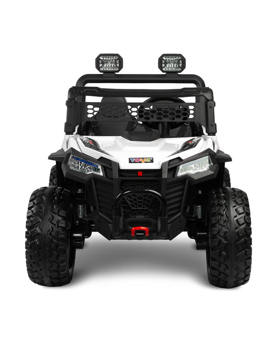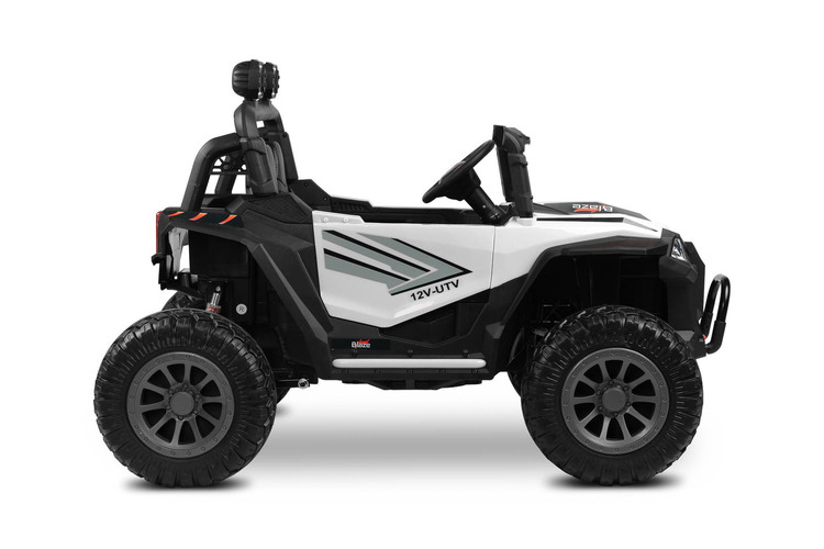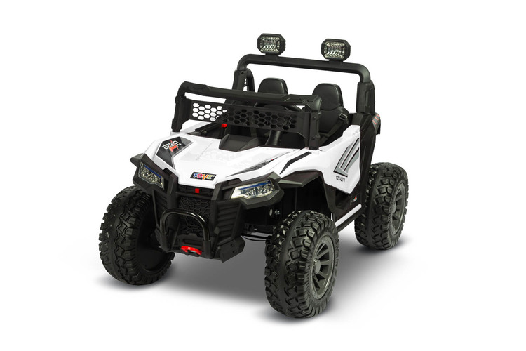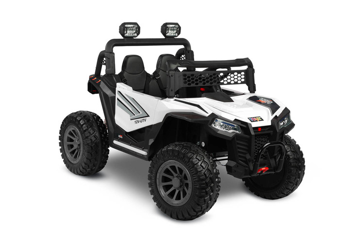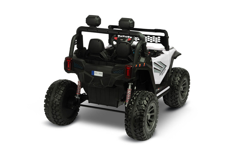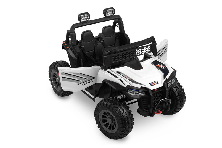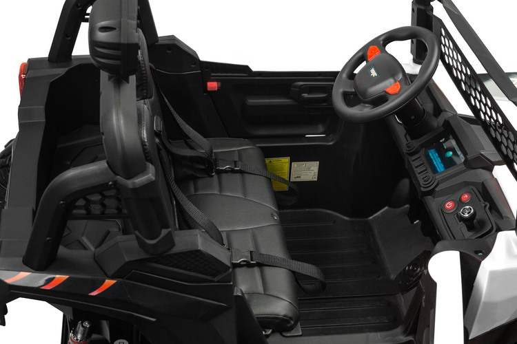 Blaze is a battery-powered off-road vehicle that will provide great fun for two children. Driving safety is ensured by a comfortable eco-leather seat, equipped with 2 sets of 3-point belts. The vehicle’s suspension has been enriched with 4 shock absorbers that will help you traverse uneven terrain, which, combined with wheels made of EVA foam, guarantees extraordinary driving comfort. Blaze is equipped with LED lights located at the front of the vehicle and on the beam above the passengers’ heads. Realism during play will be added by elements such as an opening door with a handle, a lifting hood and an open trunk at the back of the vehicle. Blaze is powered by 4 45W motors powered by one 12V10Ah battery. Parents of smaller children can remotely control the vehicle using the included wireless controller. Playing with Blaze will be made more enjoyable by a multimedia panel with USB.