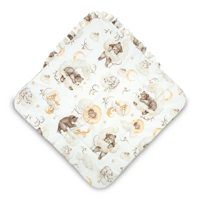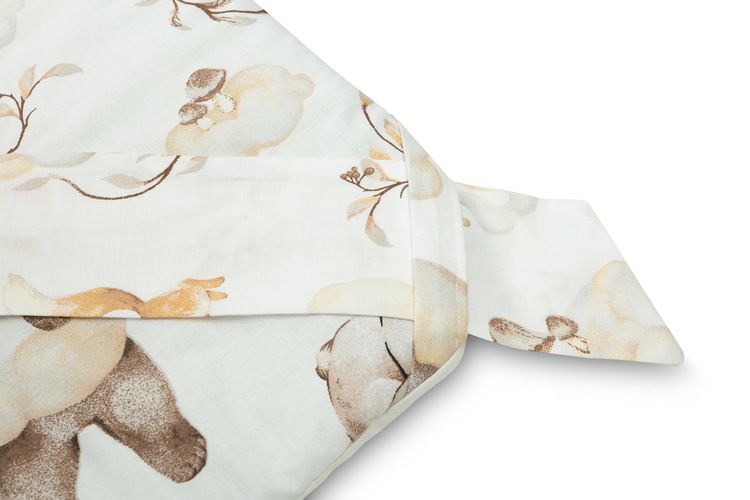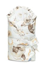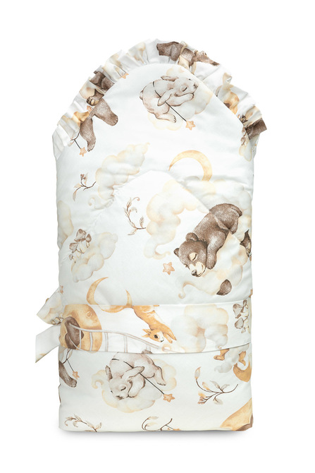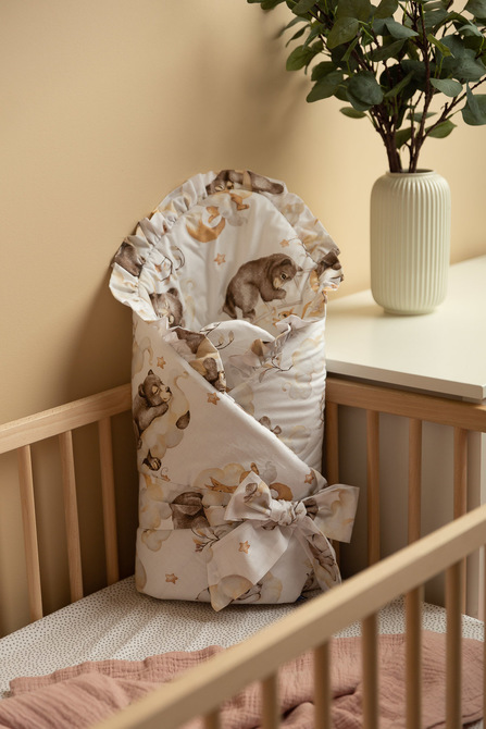 The double-sided baby wrap with a frill was created for newborns and infants. The tied fastening with a wide cotton ribbon allows you to comfortably hold the baby while feeding and falling asleep. After unfolding, the cone can be successfully used as a quilt for a cot or pram. It can also be used as a play mat. It was made of 100% cotton. The filling of the cone is fluffy silicone non-woven fabric. The finish is a tasteful frill.