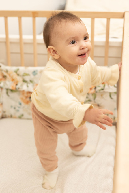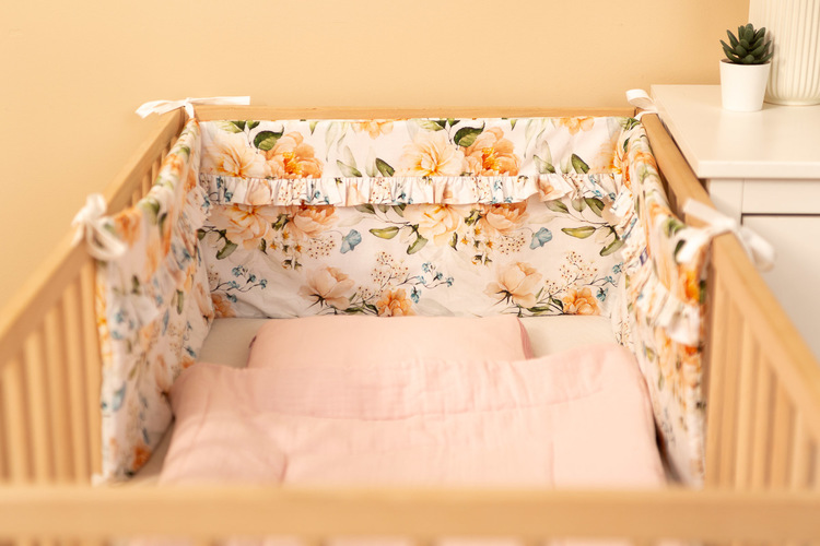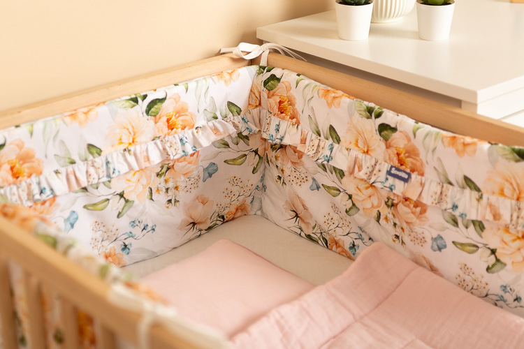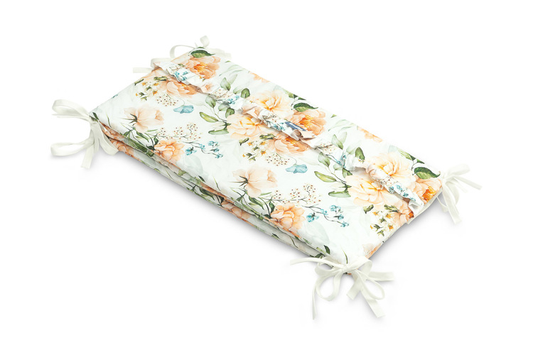 The cot bumper fits any standard cot. It is distinguished by beautiful materials and a frill sewn in, which will make the baby’s room unique. The protector is made of soft cotton with a print. The wadding filling will protect the child from injuries when moving around the cot. Keeping the protector in the right position is ensured by densely sewn ribbons used to attach it to the rungs of the cot. It was designed for a cot measuring 120×60 cm. The protector will be a great addition to the baby’s layette.