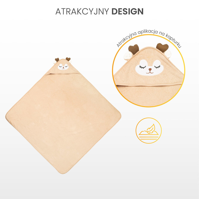 The hood protects the baby’s head from the cold and makes it easier to quickly dry the baby’s hair. Applications in the shape of cute animals attract the child’s attention and make bathing a nice accent every day.