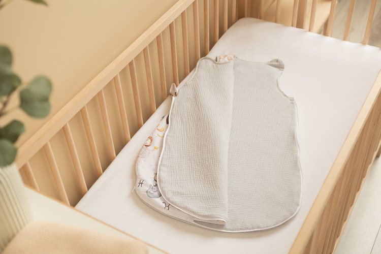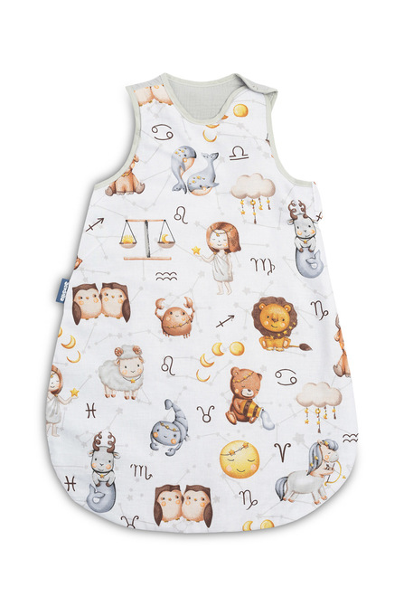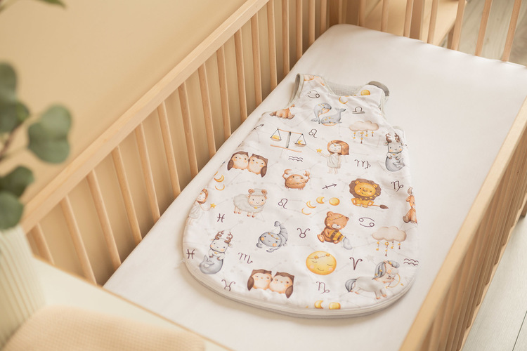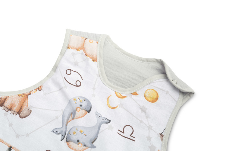 The sleeping bag will serve children from the first days of life (0-9 months), providing them with warmth and safety. It is sewn from soft cotton filled with padding. The inside and back of the sleeping bag are made of muslin cotton. The product does not contain hard elements that could irritate the child’s skin. It is equipped with a two-sided zipper, led around the sleeping bag, allowing you to change the diaper without taking the child out of the sleeping bag.
