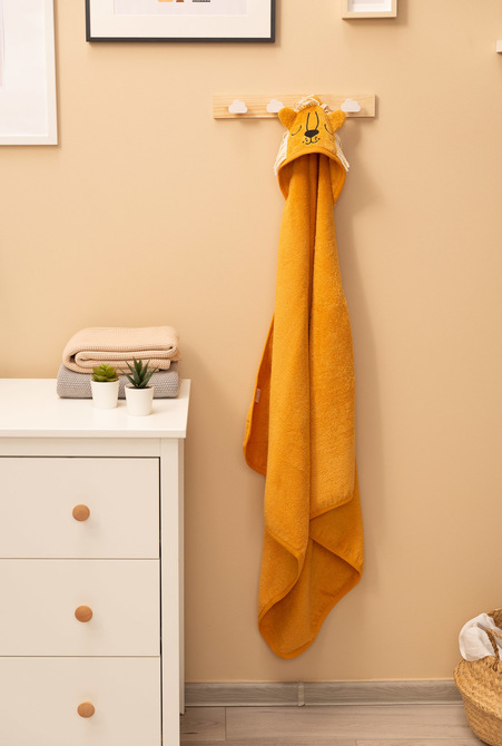 The bath towel is made of 100% delicate cotton. It is soft, pleasant to the touch and very absorbent. Thanks to its solid dimensions of 90x90cm and a spacious hood, you can easily wrap your baby tightly after bathing.