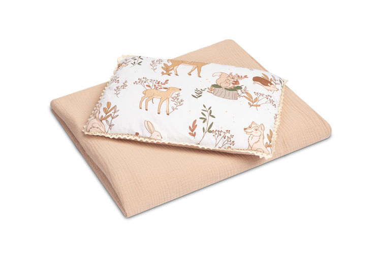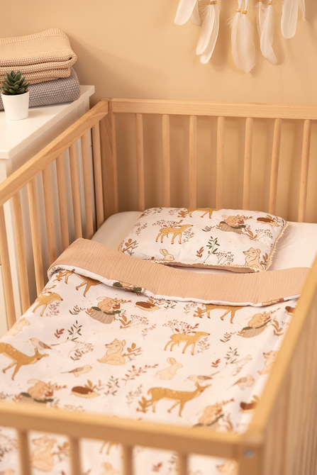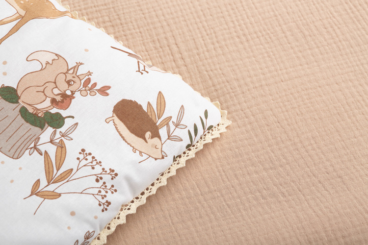 The crib set is a combination of high-quality muslin on one side and printed cotton on the other. It consists of a double-sided flat pillow and a quilt with filling. The soft cushion is finished with a tasteful lace piping. The delicate muslin fabric is breathable and provides adequate airflow. The whole set will be perfect in a crib, gondola or cradle.
