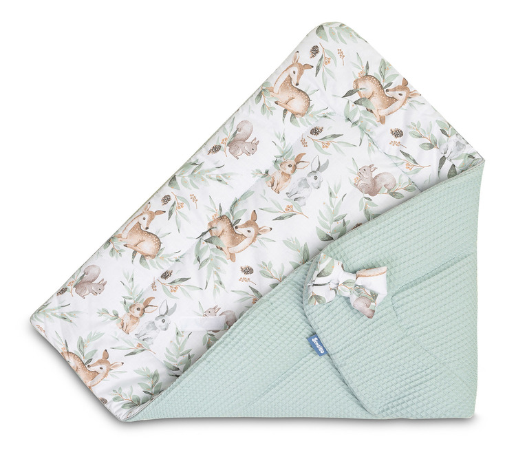 Reversible baby cone The waffle was designed with newborns and infants in mind. Velcro fastening allows you to comfortably hold your baby while feeding and sleeping. After unfolding, the swaddle can be successfully used as a quilt for a cot or a pram. It can also be used as a play mat. It was made of 100% cotton. It has an imprint on one side and a wafer structure on the other. The filling of the cone is fluffy silicone non-woven fabric.