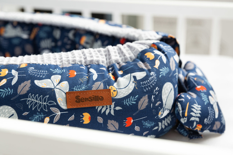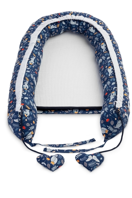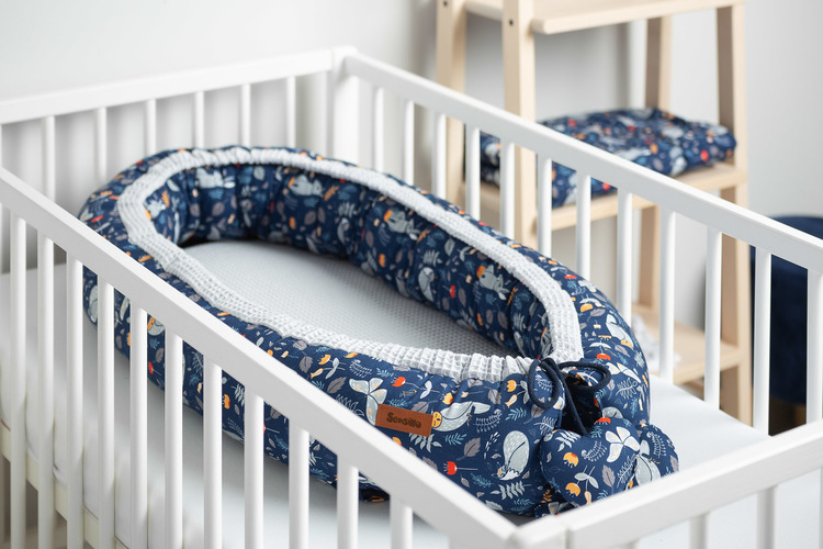 Cocoon intended for infants from the birth to ca. 6 months of age. The cocoon swaddles the baby and limits his/her space. It may be used in various ways: in parents’ bed, on a sofa, in a cot or during travels. High walls prevent the baby from rolling off. The overlay is made from 100% cotton which is airy and nice in touch.
