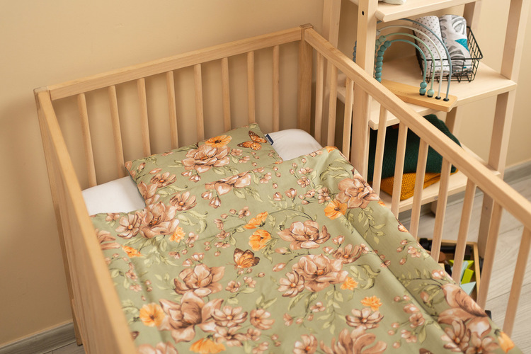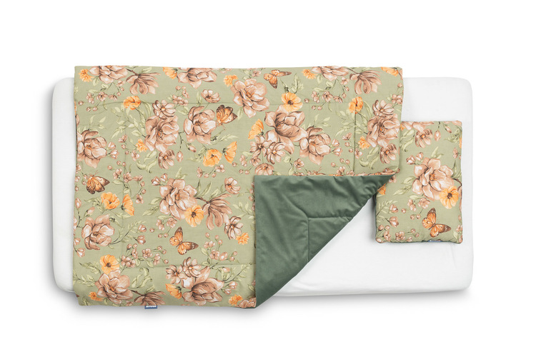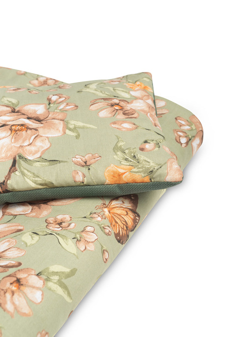 The cot set is made on the one side of high-quality colored cotton and the other of pleasant to touch velvet fabric. It consists of a flat pillow and a duvet with anti-allergic filling. The cuddly fabric will pleasantly wrap every baby.