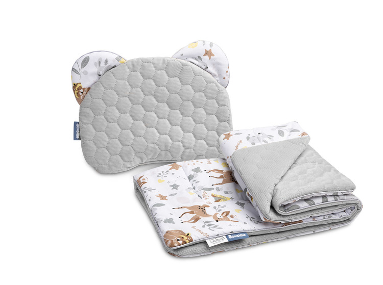 The set consists of a beautiful pillow with teddy’s ears and a duvet with a fine filling of silicone lyocell. This reversible set is made of the highest quality materials – colorful cotton and very pleasant velvet fabric which will be enjoyed by every baby. The set is perfect for the pushchairs, cots, cribs or as a mat for the baby. The pillow itself can be used as a soft toy. The high quality of this product is accented by a tasteful inset.