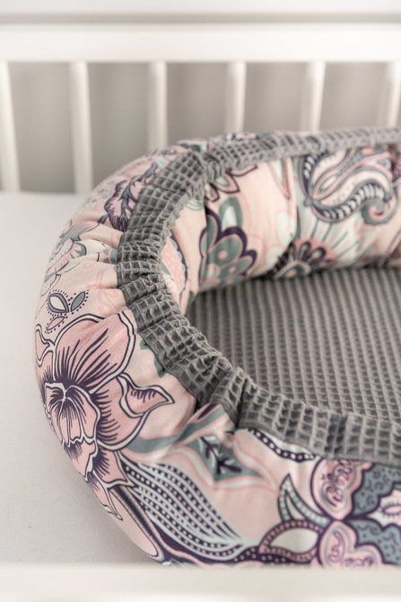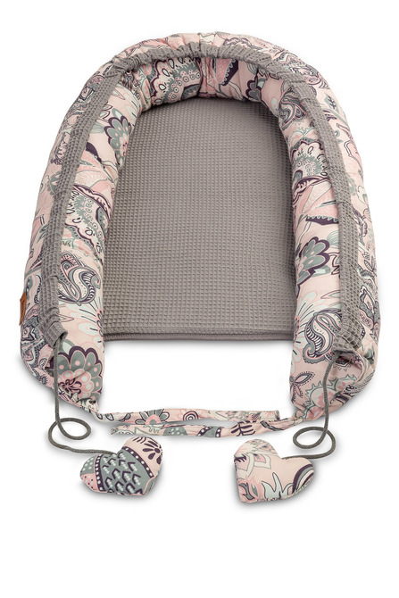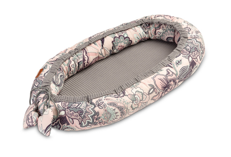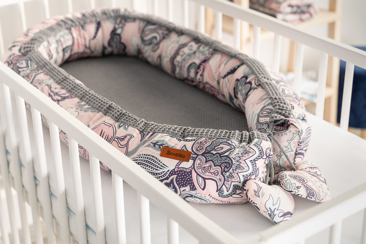 Cocoon intended for infants from the birth to ca. 6 months of age. The cocoon swaddles the baby and limits his/her space. It may be used in various ways: in parents’ bed, on a sofa, in a cot or during travels. High walls prevent the baby from rolling off. The overlay is made from 100% cotton which is airy and nice in touch.