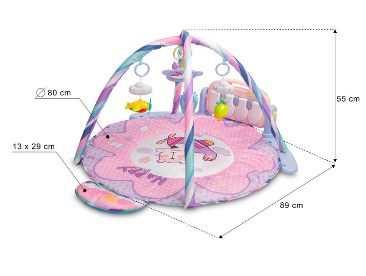 The colorful Music Mat from Toyz is a great place for toddlers to play. It is made of easy-to-clean polyester fabric with soft filling that insulates and provides comfort. It comes with a cushion that will provide extra comfort when playing in a lying down position. Sensory toys are suspended from the riser to stimulate baby’s development and engage his attention. The biggest attraction of the mat is the large musical keyboard. It has four large keys that make sounds, as well as buttons to change their sound to 1 of 3 types. It is also equipped with a button that turns on soft melodies and a 2-stage volume control. The keyboard is powered by 3 AA batteries.