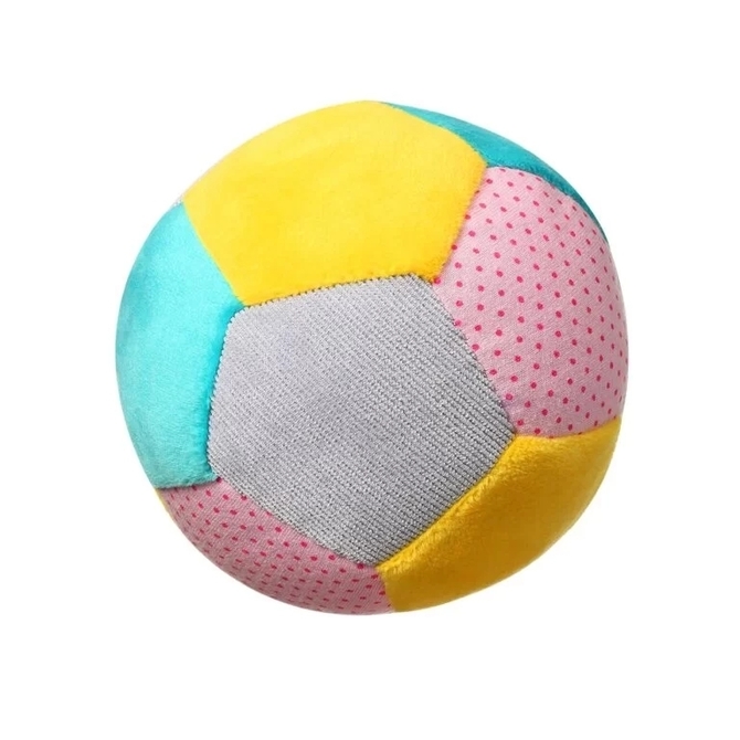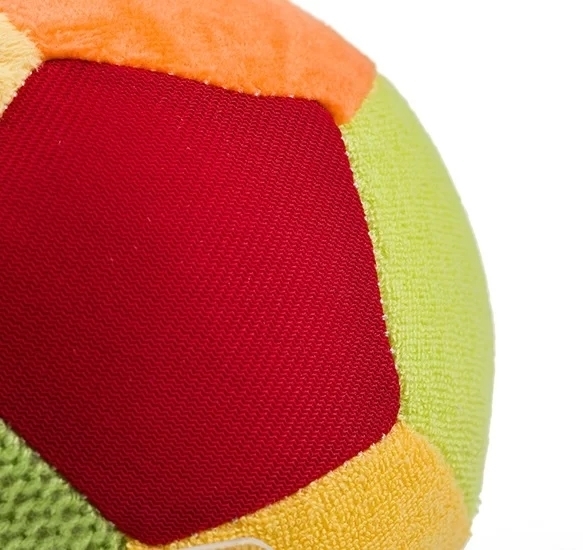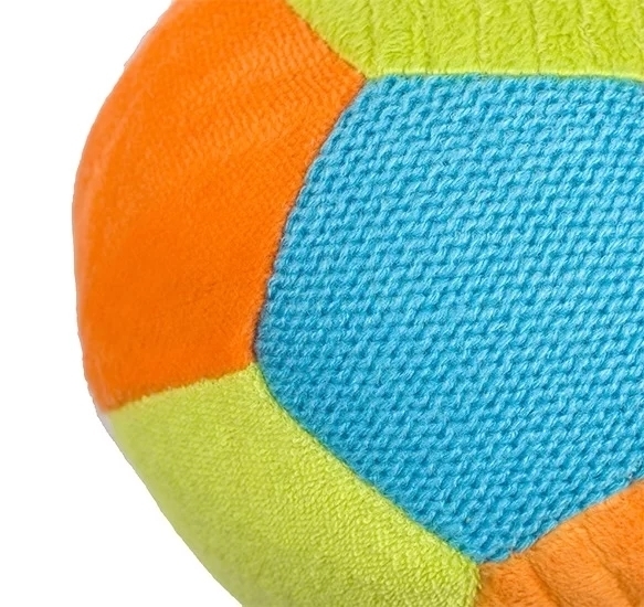 Varied, contrasting colours arranged in geometric pentagons focus vision of the child and help to distinguish colours, and the subtle sound of the bell inside the toy encourages playing. The softness of the ball encourages grasping and shifting it from one hand to the other.