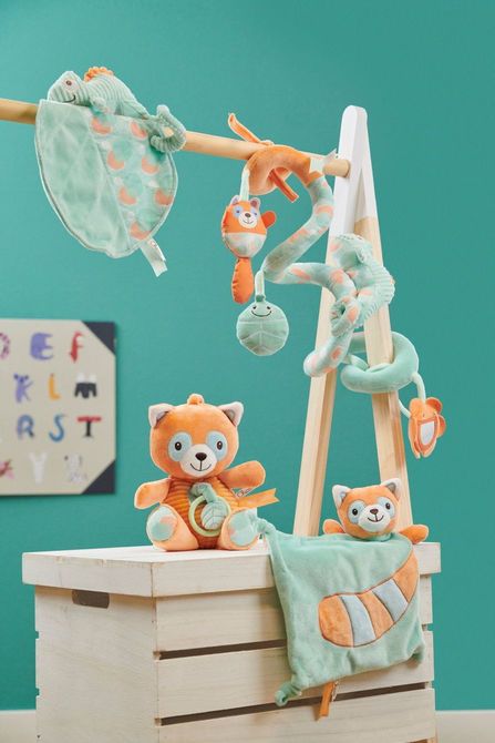 • A toy that provides endless fun for little ones thanks to many activities: a leaf with a rustling effect, a red panda figure and a flower-shaped mirror.