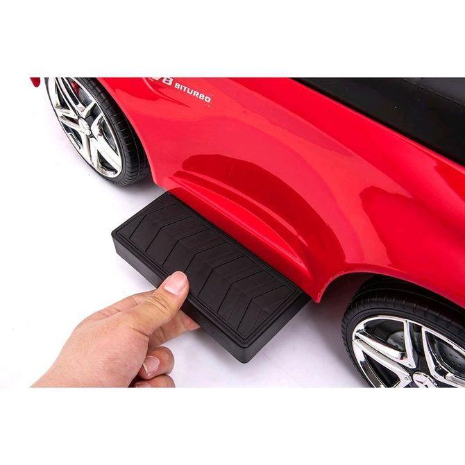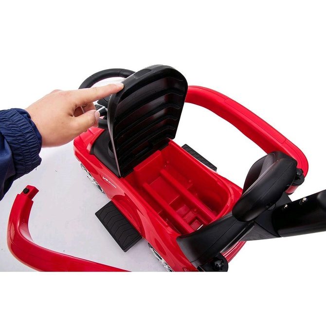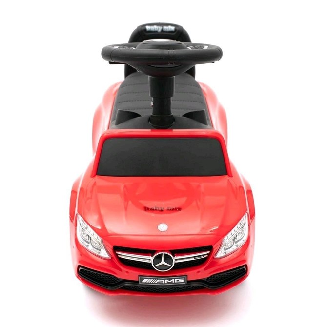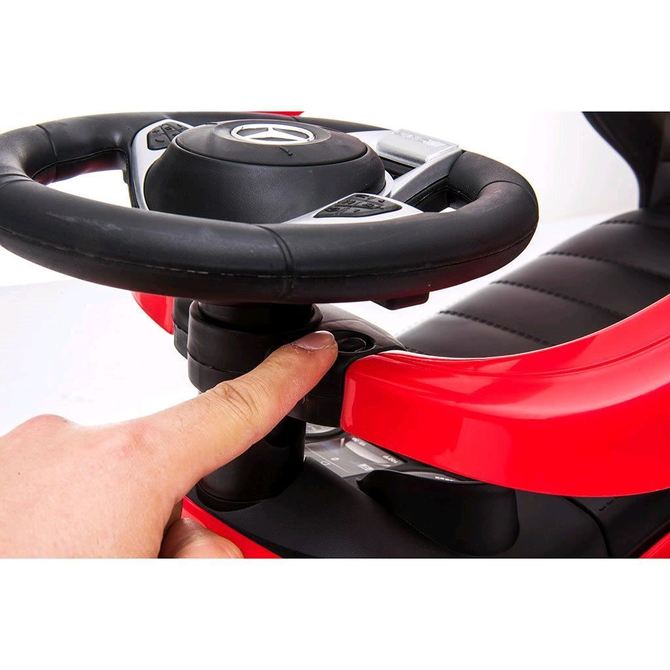 Children’s ride-on bike with a handle Mercedes Benz Baby Mix, made of high-quality plastic. Its appearance attracts the eye of not only children, but also parents. Your little racer will feel in it like in a real Mercedes. The ride-on helps to develop the child’s motor skills, and also guarantees a lot of fun and joy. On the steering wheel there is a spectacular horn and a button with six saved melodies. Designed for both smaller children who can sit up and for children who have already learned to walk. This toy car will provide a lot of fun. It has the unique look of a real Mercedes, a comfortable wide seat with space for toys and other treasures, a steering wheel, high-quality plastic wheels and a comfortable and solid guide. On the back of the backrest there is a button that is used to switch driving functions, the wheels of the car are controlled by the steering wheel. The handle, armrests and footrests can be removed, and thus the child uses the car as a classic ride-on. After moving the button to the guide position, the wheels of the car are controlled by the parent using the handle. It can be set in two positions. The package does not contain batteries (2x AA 1.5V). The car can be used as follows: