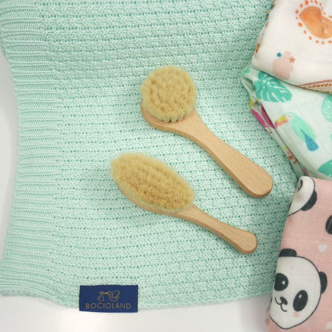 Made of natural goat hair with a wooden (beech wood) handle with a safe round shape. The size of the brush is perfect for a baby’s small head. The delicate bristles are perfect for sensitive skin and do not electrify the hair. The massage performed with this brush is perfectly calming and relaxing, and is pleasant for mother and child.