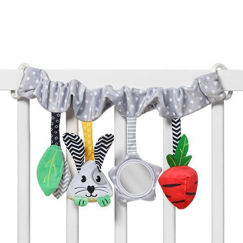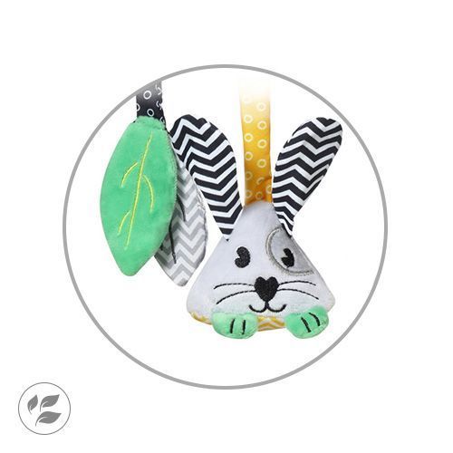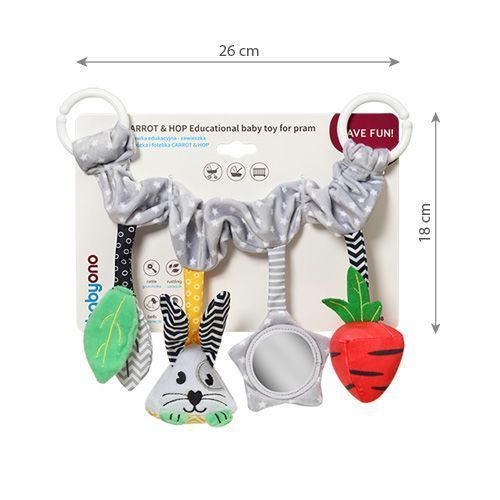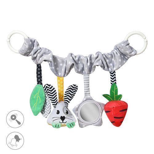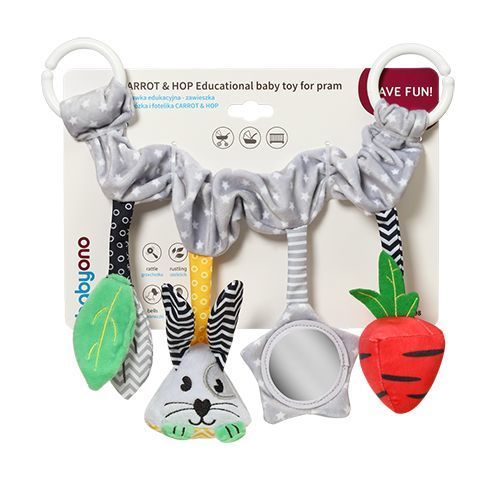 Carrot & Hop, an educational stroller toy with elements of contrast, will make your child’s world more diverse while supporting their eye-ear and hand-eye coordination. Affix it to a stroller, crib or car seat to keep your baby busy while walking or traveling. There is a rustling leaf and a rattling bunny with contrasting color ears attached to the toy, which is covered with fabric which is very pleasant to touch. Other items offered to your kid include a mirror and a gently rattling carrot. The interesting choice of elements which are nice to touch and attract the baby’s attention with their diverse designs and colors. They let your baby discover the world and improve their manual skills through play.