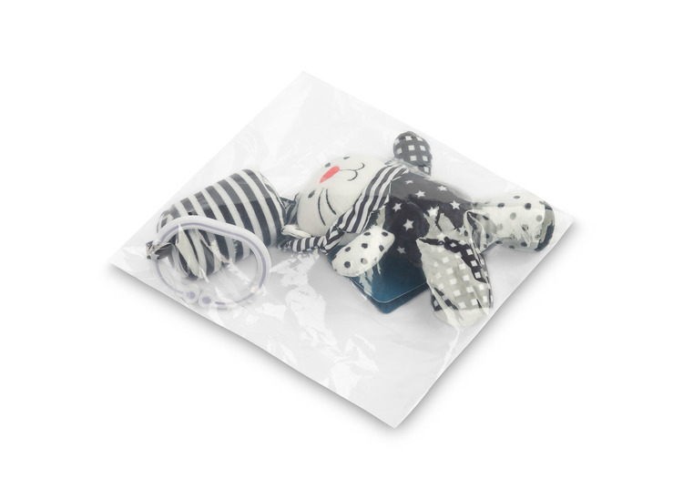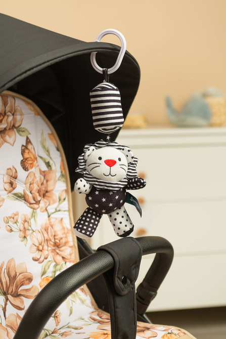 A stroller pendant for infants, featuring contrasting black and white colors, is designed to promote visual stimulation and sensory development in the baby. Its simple yet highly functional design captures the child’s attention, while the diverse textures and shapes offer engaging play.