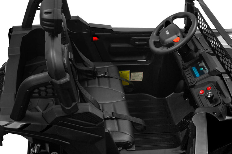 Blaze is a battery-powered off-road vehicle that will provide great fun for two children. Driving safety is ensured by a comfortable eco-leather seat, equipped with 2 sets of 3-point belts. The vehicle’s suspension has been enriched with 4 shock absorbers that will help you traverse uneven terrain, which, combined with wheels made of EVA foam, guarantees extraordinary driving comfort. Blaze is equipped with LED lights located at the front of the vehicle and on the beam above the passengers’ heads. Realism during play will be added by elements such as an opening door with a handle, a lifting hood and an open trunk at the back of the vehicle. Blaze is powered by 4 45W motors powered by one 12V10Ah battery. Parents of smaller children can remotely control the vehicle using the included wireless controller. Playing with Blaze will be made more enjoyable by a multimedia panel with USB.