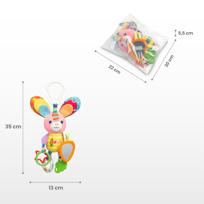 The toy has a mirror, rattle and various elements for grabbing and biting. Vivid colours and contrasting patterns attract the child’s attention and support the development of vision, while soft ears and protrusions encourage exploration and stimulate the sense of touch.