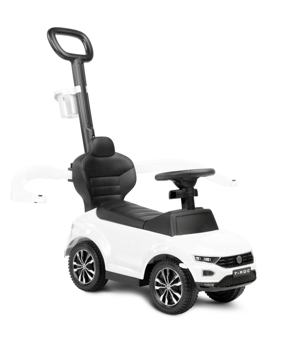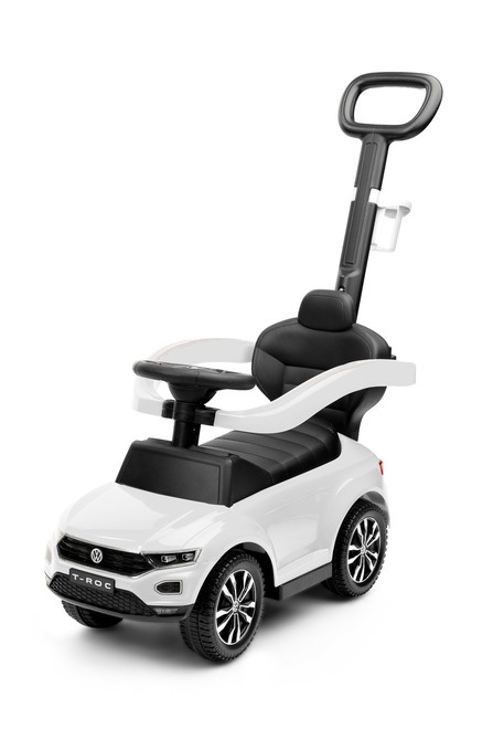 The VW T-Roc from Toyz is a ride-on ride for children. Thanks to the license of the Volkswagen brand, the aggressive nature of a real SUV has been faithfully reproduced. The ride-on bike is perfect for walking together. The child can move independently, and when tired, the parent will easily take control of the vehicle. Retractable platforms allow for safe support of the feet, and the railing protects against falling out. There is a toy compartment under the seat. There is a cup holder on the handle.