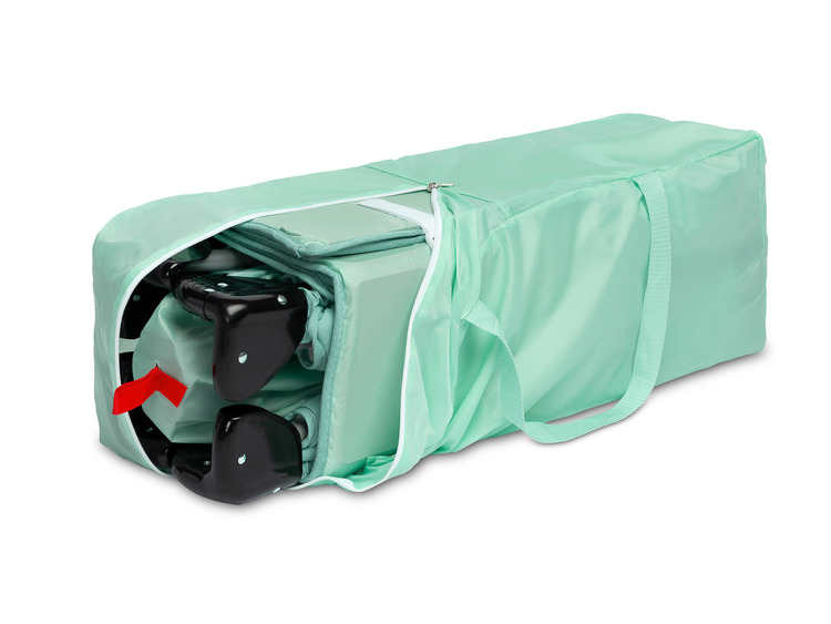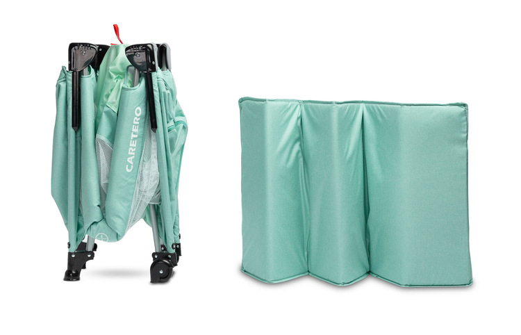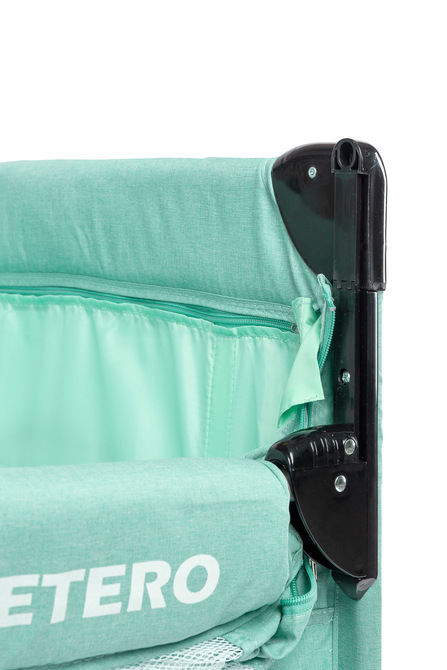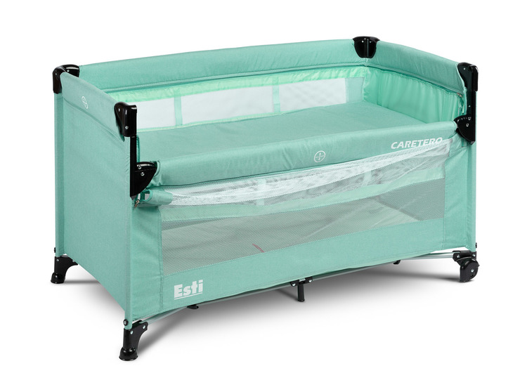 The Esti cot is a travel cot designed to facilitate the care of babies. Its biggest advantage is the foldable side, which transforms the cot into an extra bed and provides more comfortable access to the child. The practical folding mechanism means that folding or unfolding takes only a moment. The cot also has wheels with a blockade for easy portability. The side door closed with a zipper will allow older children to safely enter the cot, which can be used as a playpen. The cot complies with the EN 716: 2017-07 standard