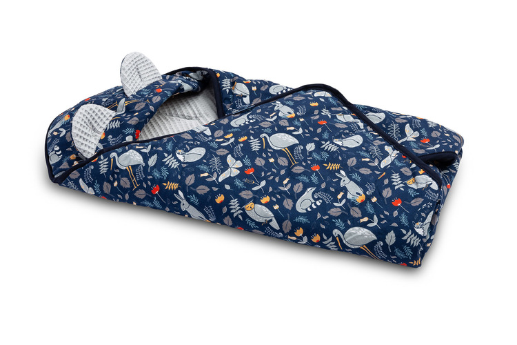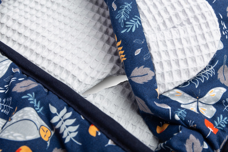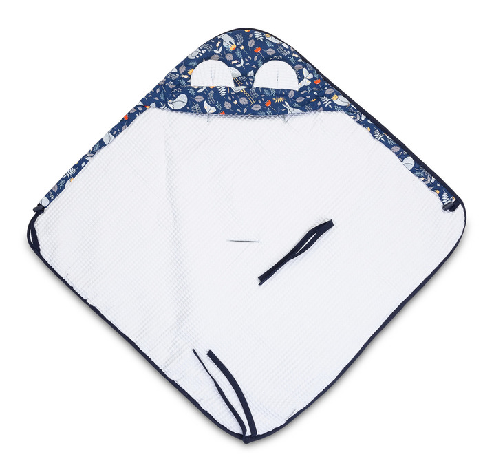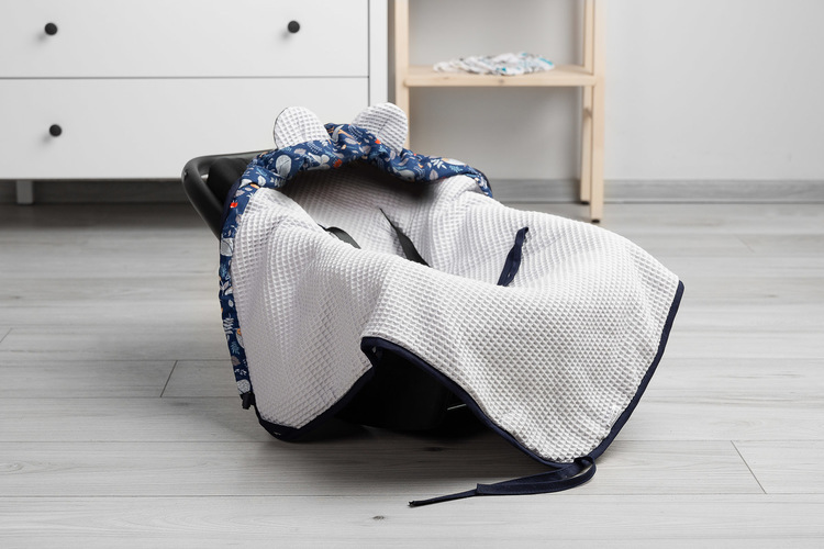 Waffle carry-cot swaddle blanket was designed for the youngest children. It is comfortable and really practical during travelling. It is an alternative for warm children’s clothing. Thanks to holes for 3-point belts it is really functional – there is no need to unfasten the belts to uncover the baby in the carry-cot. The swaddle blanket has an adjustable hood with lovely ears. It is made from 100% cotton.