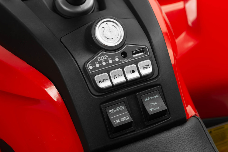 GIGANT is a TOYZ quad bike that will ignite your child’s passion for off-road riding. The comfort of the four-wheeler is ensured by a spacious seat made of eco-leather. 4 powerful 45 W motors and large wheels made of high-quality EVA foam make the GIGANT easily cope with uneven terrain. The vehicle has 2 driving speeds and the ability to drive backwards. The multimedia panel with USB and Bluetooth inputs will allow you to play your favorite tunes while having fun. GIGANT can be controlled by a parent using a remote control.