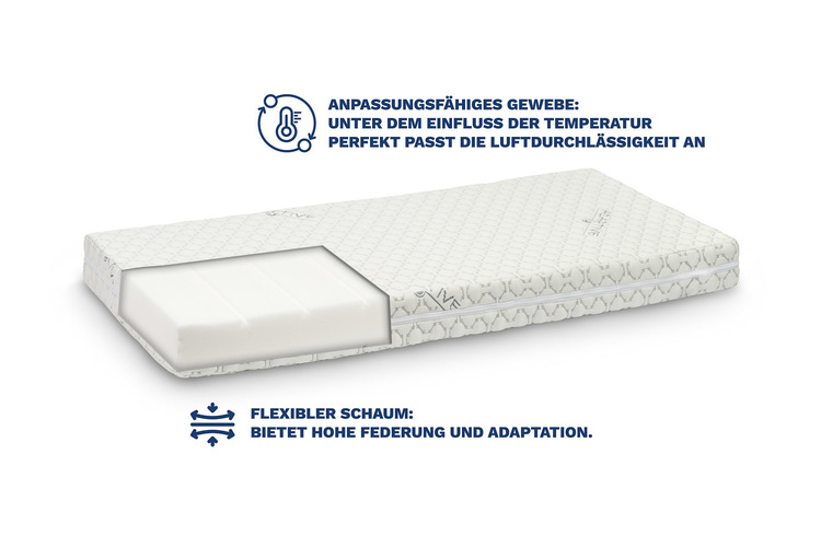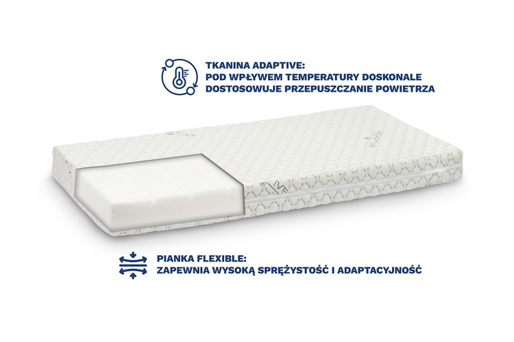Mattress Flexible is a double-sided mattress made of technologically advanced materials – Adaptive fabric and Flexible HR foam. In response to heat, the weave in Adaptive fabric becomes looser, ensuring faster heat dissipation, and returns to its original form as the temperature drops. Thanks to these properties, it helps maintain appropriate thermal comfort during sleep. Additionally, it is soft to the touch and pleasant to the skin. Flexible HR foam is a material with high elasticity and adaptability. It easily adapts to the shape of the body, providing comfort and adequate support. The materials used guarantee excellent air circulation and prevent the child from overheating during sleep. The mattress cover is removable.